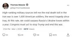 The discussion centers on the perceived futility of American military involvement, with claims that American servicemen are dying in the Middle East without reason. One user questions if "war" is present, while another asserts that more Americans died in a Texas bar than in the current conflict. There's also commentary on leftists despising the working class and anger over the downfall of "third world dictators." A question is raised about the views of non-MAGA progressives.